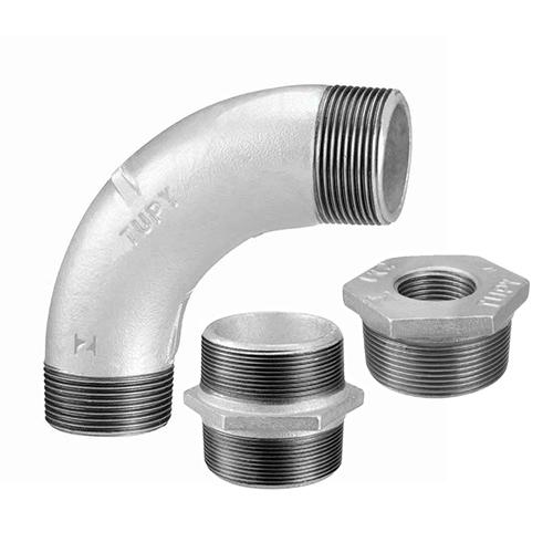 Conexões em ferro maleável com acabamento galvanizado (zincagem por imersão a quente), com rosca BSP e NPT e classes de pressão 150 e 300 libras. As conexões galvanizadas são aplicadas para a condução de água, gás, vapor, óleo e outras aplicações hidráulicas em geral. Fornecemos os mais variados modelos: